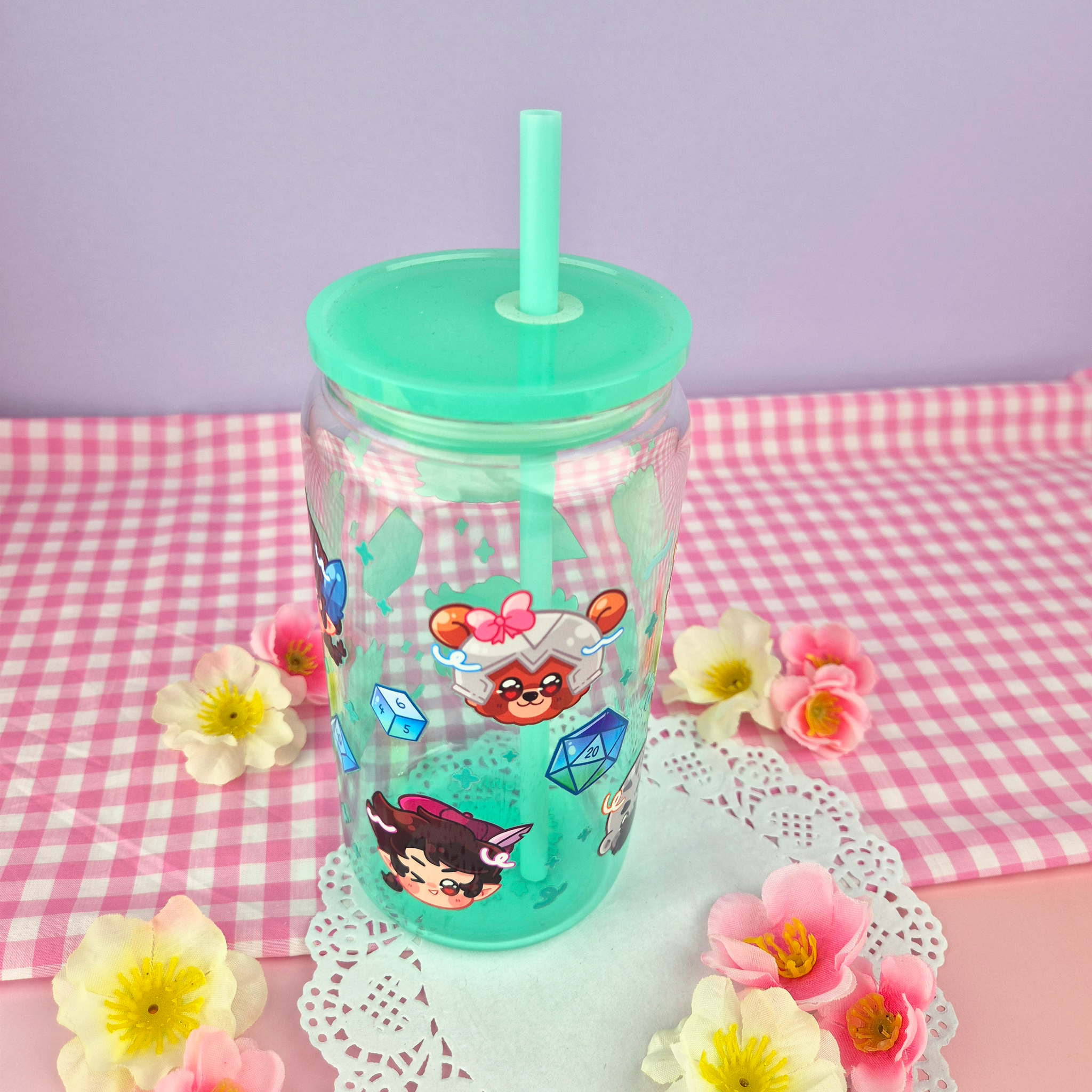 Includes a matching colourful plastic lid and plastic straw. The glass is gradient tinted from the bottom, fading into a clear glass.